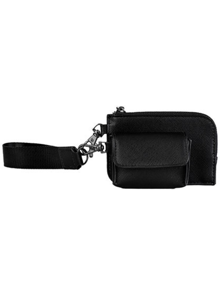 100% PU in Lederoptik | Feinkörniges Saffiano-Leder | 3-teiliges Produkt | Ohrhörer-Etui mit Druckknopföffnung | Armbandriemen aus Gurtband | Kartenetui mit Reißverschluss | Besätze aus hochglänzendem, goldfarbenem Metall | Abreißetikett 100% Polyurethan nicht waschbar Polyurethan (bis 100%)